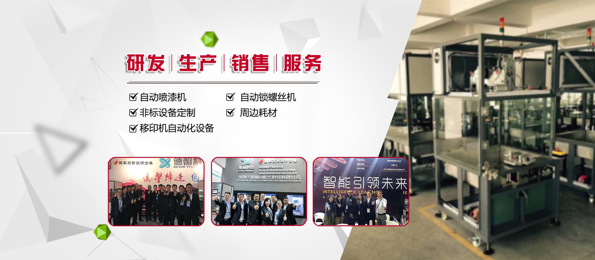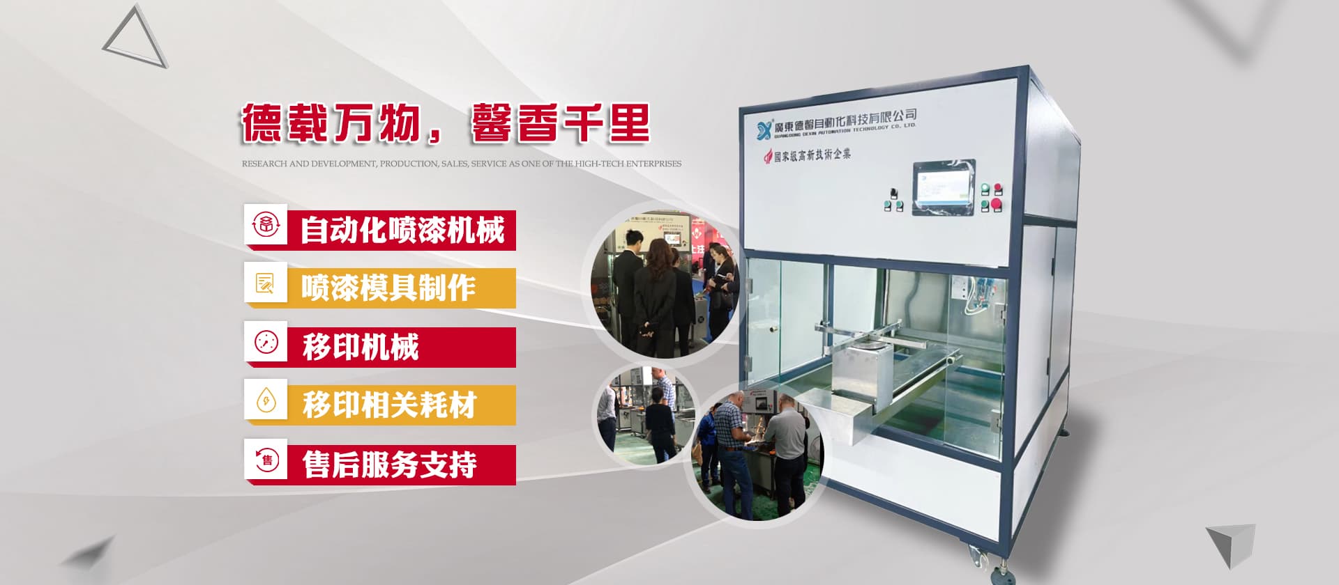 德馨科技創(chuàng)立以來,以改變噴印業傳統手工生產模式為目標,產品開發(fā)制造堅持以“環(huán)保、智能”為理念,為企業的生產環(huán)境、人力成本、生產效率等提供更為優(yōu)良的服務和技術支持。公司研發(fā)產品主要有自動化噴漆機械、噴漆模具制作等;生產銷售移印機械及移印相關耗材,包括菲林設計輸出;鋼板制作、移印膠頭制作、定位制作及周邊配件耗材并提供完善的售后服務支持。
